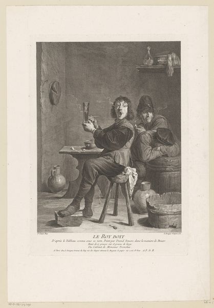 Editor: This is "Bedelende jongen met hond" – Begging Boy with Dog – an engraving by Hendrik Wilhelmus Last, created sometime between 1827 and 1863. It’s currently housed here at the Rijksmuseum. The subject matter is quite direct; a young boy with a dog, seemingly down on their luck. I am immediately drawn to the contrast in textures; from the rough coat of the dog to the boy’s worn clothes, what compositional elements stand out to you? Curator: The image's structure is rooted in its tonal contrasts. Consider how the artist has employed light and shadow to sculpt form. The soft, diffused light across the subject and dog create a stark relationship with the more obscured setting. The relationship establishes a thematic balance between vulnerability and resignation in an unforgiving world. Can you describe the boy's pose in terms of structural principles? Editor: He’s kneeling, offering his upturned hat. One hand gestures towards the viewer, maybe an invitation or plea? His body almost mirrors that of the dog; creating a shared experience in suffering. What about the formal structure heightens this reading? Curator: Precisely. The echoing forms and subdued palette—achieved through engraving—flatten the image; further underscoring the relationship between human and animal and its subtle gradation from light to dark. These techniques force our eye across the horizontal expanse of the scene, emphasizing their shared experience rather than isolating them. Note how this contrasts with, say, more romanticized portrayals of childhood prevalent during this period. Did anything in this image stand out to you? Editor: Yes! The texture within the image feels… raw. Is that connected with Last’s choices on material? Curator: Without question. Engraving lends itself to fine detail but also a certain austerity. The strategic hatching creates shadow without resorting to dramatic color. The artist's control is evident in the modulation of these lines to achieve form and depth. Considering these elements, what overarching themes do you observe in this print? Editor: So, looking closely at the lines, shadows, and even how the boy is positioned within this sort of gloomy landscape, you start to consider poverty, hardship, and resilience from Last’s work! This has certainly brought a different dimension to how I understand artistic choices. Curator: Agreed. Understanding the structure reveals so much more than simply a sentimental scene.