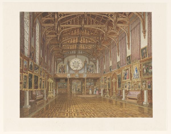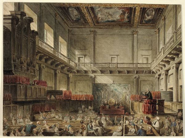 Editor: We’re looking at Canaletto’s "The Doge and Grand Council in Sala del Maggior Consiglio," created with oil on canvas sometime between 1761 and 1765. It feels so…regal and distant at the same time. What symbolic meanings do you see embedded in this representation of Venetian power? Curator: The painting certainly radiates authority, but I find it intriguing how Canaletto achieves this through visual symbols tied to the collective memory of Venice. Notice the repetition of architectural motifs; what do these forms tell you about the importance of structural legacy and continuity for this culture? Editor: I hadn’t thought about it that way, but the arches and rectangles are repeated everywhere, from the ceiling to the windows, even in the tapestries or paintings hanging on the wall. It’s like the room itself is reinforcing their authority. So, is it less about individual power and more about enduring systems? Curator: Precisely! Consider the robes of the figures as well. Their uniformity contributes to a sense of collective identity that supersedes the individual. How does that visual impact contrast with what we know about Venetian history and individual aristocratic families? Editor: That’s interesting. I always thought of Venice as being full of powerful, squabbling families, but this shows a unified front. Maybe Canaletto is idealizing a sense of order that wasn't quite real. It feels more staged and formal. Curator: Do you find in the details in ceiling, or in the wall decorations an allegorical program meant to shape a narrative? What kind of audience do you imagine responded to this? Editor: Thinking about it that way, you almost see that the painting's ideal is not as powerful in our days, the memory fades through history and the work remains only as beauty to behold. It’s amazing how one image can encapsulate so many layers of history and meaning. Curator: Indeed, it invites us to consider what imagery endures, and what aspects are actively transformed, across the currents of time.