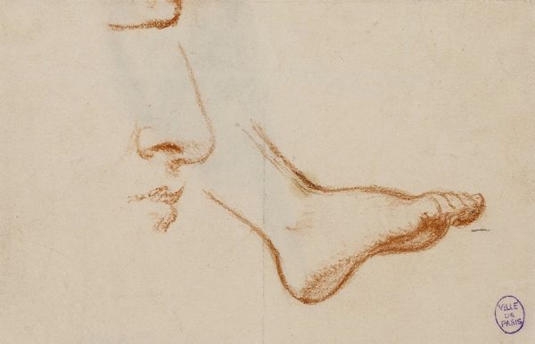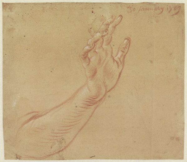 Jens Juel sketched this study for a full-length portrait of Crown Princess Sofie Frederikke, using red and black chalk. The composition, dominated by detailed studies of hands and arms, presents a fascinating interplay of form and function. Juel’s approach is meticulous; each line carefully delineates the contours of the hands and arms, capturing the subtleties of gesture and form. The use of red chalk gives warmth to the skin tones, while the black chalk adds depth and shadow, enhancing the three-dimensionality of the limbs. The stark contrast between the detailed studies and the minimal background emphasizes the artist's focus on these specific elements of the portrait. The open, gestural quality of the study invites the viewer to consider the process of creation. It prompts us to question how these fragmented sketches contribute to the final, polished portrait. Does the meticulous detailing of the hands imbue them with symbolic meaning, perhaps alluding to the Princess's grace, intellect, or regal bearing?