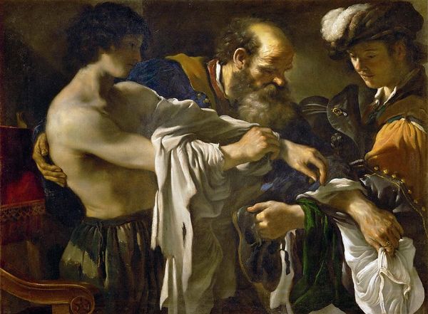 Editor: This is "The Liberation of Saint Peter," painted in 1622 by Guercino, using oil paint. The thing that immediately strikes me is how dark the whole scene is, and then you notice the angel pointing outwards with a dramatic gesture. What do you make of it? Curator: Indeed. Notice how that single extended hand acts as a visual directive, guiding us, the viewers, but also Saint Peter. Hands in art are so incredibly powerful because they’re about communication and agency. Guercino uses the imagery of liberation, an angel leading the way, to portray something much deeper – an awakening. Editor: Awakening, how so? Curator: Peter is being led from the darkness of imprisonment into, potentially, the light of understanding. He looks confused. But also, consider the sleeping guard. He represents the sleep of ignorance, unaware of the miracle unfolding. This links to older visualisations of death. Editor: So, it’s not just a historical event being shown here? Curator: Precisely. Guercino employs symbols that resonate far beyond the literal narrative. What do chains signify? Beyond physical confinement, what else could they represent? Editor: Hmm, perhaps chains of old beliefs, or something holding you back spiritually? And liberation is more about breaking free from those internal restrictions? Curator: Exactly! And this resonates across cultures and faiths, making the artwork both historically significant and timeless. What do you think of it now? Editor: I see it quite differently. The symbolism makes it much more powerful and universal, transcending just the religious story. It is now something deeply personal, about my own inner limitations. Curator: Yes, and that is the magic of symbolism: its ability to continually reshape meaning for the viewer across centuries.