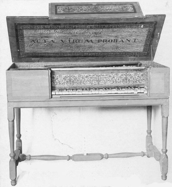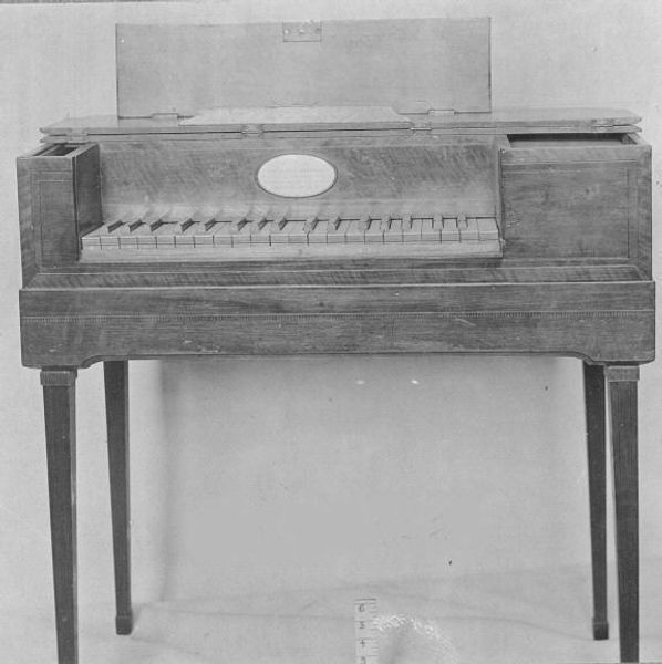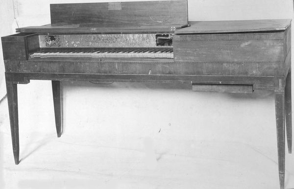 Curator: Here we have a photograph of a Square Piano, made between 1791 and 1815. Editor: Immediately, it whispers secrets of bygone drawing rooms to me. The composition, stark and shadowy, lends the piece a nostalgic aura. Does it speak to you? Curator: It certainly does. Contextually, this style of piano coincided with significant shifts in musical performance and accessibility, and also relates to evolving societal gender roles of the time. The instrument appears almost anthropomorphic, possessing a silent agency that hints at narratives beyond pure aesthetic formalism. Editor: Agency... I like that. Looking at those keys—almost worn smooth—I imagine clandestine sonatas being composed under candlelight. Do you think the photographer, Katholnig, felt that ghostly presence? Curator: Considering that Katholnig worked in a period defined by rapidly developing technology and ideologies, one can surmise that he was concerned with how photography could both preserve the past and also engage with a new, changing cultural landscape. He would have positioned himself in the cross currents of progress and tradition. Editor: That's such an interesting lens! I hadn't considered how new and exciting photography must have been back then. But thinking about these old instruments... there's also a touch of sadness about it, this idea of silencing, especially within patriarchal structures. Curator: Precisely. Its presence invites reflections on domesticity, artistry, and the subjugation of women, issues we continue grappling with today. It allows for intersectional explorations of gender, class, and artistic production. Editor: Right. Seeing this, I remember taking my first music classes. Such intense discipline, sitting in a hard, straight-backed chair while trying not to wince from boredom! Perhaps some rebellions against structures start small…at a piano. Curator: It’s evocative, no doubt. In studying images such as these, and the cultural contexts that birthed them, we develop greater insight into art history, critical theory, and social issues. It can offer many useful understandings to broader patterns and practices. Editor: Yes. It resonates in unpredictable ways if you just open your mind to it. Like unearthing old love letters in your attic. Curator: Beautifully said. Editor: A very pretty photograph indeed!