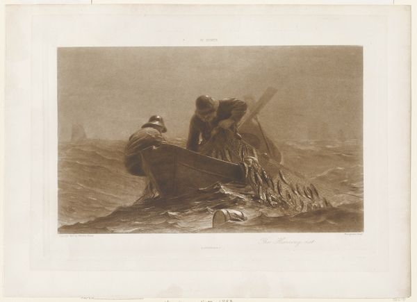 Henri Wouters created this artwork, titled "Garnalenvissers," with etching. The composition focuses on the daily lives of shrimp fishermen wading through shallow waters, the bent posture of the workers is a recurring motif throughout art history, symbolizing labor, toil, and a close connection to the earth. We see this echoed in Millet's "The Gleaners," painted decades prior, where the bowed figures evoke the hardship and dignity of rural life. Such postures carry with them the emotional weight of human endurance. Here, the fisherman's stance speaks to a universal experience of physical exertion and perhaps, the quiet resilience of those who live by the sea. Across centuries, we find this embodied in countless representations of laborers, each contributing to a visual lexicon of human effort and adaptation. It's a collective memory of labor, deeply embedded in our cultural consciousness.