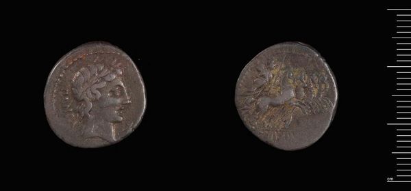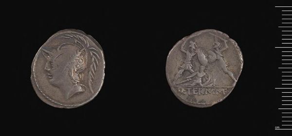 Editor: Here we have the Denarius of Q. Titius Mutto from Rome, and what strikes me is how this tiny object could have been an instrument of power. What story does it tell about its time? Curator: This coin isn't just currency; it's propaganda. The imagery, likely chosen by Mutto himself, projects a specific image of Roman virtues and authority. What do you notice about the figures depicted? Editor: Well, one side shows what appears to be a figure in a helmet and the other a winged horse. Curator: Precisely. The helmeted figure evokes military strength, while the winged horse, Pegasus, suggests divine favor and perhaps even aspirations of glory. How might this coin influence the perception of Mutto and his role in Roman society? Editor: I guess it's a constant, pocket-sized reminder of Roman power and status. It really makes you think about how art is used to promote ideologies. Curator: Exactly. This coin reveals how art, even in the most mundane forms, operates within a complex web of social and political forces, shaping public opinion and reinforcing power structures.
