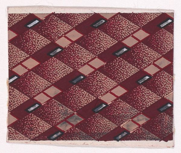 Curator: The design before us, titled "Textile Design with a Basketweave Pattern Decorated with Pearls," was created anonymously around 1840. You'll find it within the decorative arts collection at the Metropolitan Museum. Editor: My first impression is that this design, despite its age, feels surprisingly modern, in the way the colors clash together while having a cohesive design; a balance between visual excitement and elegant orderliness. Curator: It's fascinating to consider its context, isn't it? This drawing or print embodies the industrial and artistic shifts of the era. Basketweave patterns are ancient, ubiquitous. However, rendering it in such a controlled fashion and presenting it for textile production suggests the rise of both mechanized weaving and consumer culture. What do those pearls signify to you, though? Editor: The "pearls," set against the woven ground, suggest more than just adornment. Throughout history, pearls often symbolized purity, wealth, even tears. Their presence here likely elevated the status of the fabric design. Were they intended to be represented literally with pearl embellishments or are they more generally suggesting an increased monetary and material value? Curator: That's the puzzle, isn't it? Are the "pearls" just another design element mimicking surface texture? Or did the artist/designer intend real pearls to be applied to the textile? Perhaps this was meant for an aspirational upper-middle-class market, eager to emulate aristocracy. I can't help but think about the working conditions in textile mills at this time—vastly different from the luxurious associations of pearls. Editor: The pearl imagery perhaps also serves as an idealized projection onto a rather grim reality. Think of folk tales, myths; there is a universal language woven through them about loss and recovery that is reflected in adornments like pearl patterns that this particular design appears to emulate. Curator: Exactly, these visual echoes and symbolism can reflect the psychological pull these items hold even while mass production distances us from craft. Ultimately, viewing this textile design allows a consideration of materials and methods alongside cultural symbolism and subconscious desire. Editor: I agree entirely, that tension really makes the image shimmer! A dialogue between design, dreams, and stark material conditions.