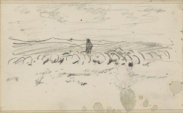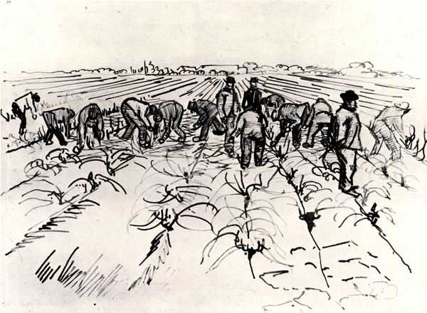 Curator: At the Rijksmuseum, we have Rein Dool's "Villa Dugo," a 2006 ink drawing on paper. It presents a captivating landscape. Editor: It’s so detailed and precise. There is an underlying somberness about this seemingly cheerful scene, perhaps a feeling of transience. Curator: I see it too. Dool created this drawing at a time when there was renewed focus on realist landscape art amidst globalization, responding to concerns of environmental change and rural identity. He engages with themes prevalent during the early 21st century. Editor: The composition is remarkable; see how the dark sunflowers in the foreground lead your eye toward the lighter, almost fading, background? This creates depth and an almost melancholic perspective. Curator: Absolutely. Consider the socio-political impact of agricultural policies. Farmers during this time increasingly depended on market pressures to produce more goods. So what do the sunflowers here signify in terms of sustainability, landscape, or even capitalist growth? Editor: Focusing on technique, notice how the lines are controlled but loose, full of character. The heavy linework contrasts wonderfully with the sketchier treatment of the sky and distant land. Curator: That "heaviness," as you call it, makes it feel monumental and also hints at industrialization's impact on Dutch landscapes. Dool's artistic choice prompts critical questions about man's role. Editor: Indeed. I particularly love how the textures of the paper add another dimension; the ink bleeds just so, offering softness against the precise lines. Curator: When looking at this piece through our current socio-ecological challenges, "Villa Dugo" provides viewers a thoughtful lens to explore how the relationship with landscape continues to evolve. Editor: I find it rewarding how Dool allows viewers to decode layers of meaning, blending skill and concept so subtly in monochrome.
