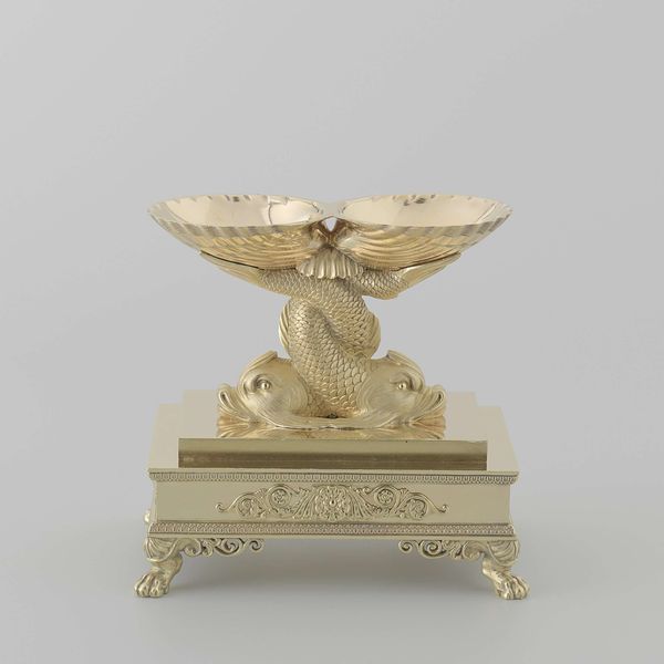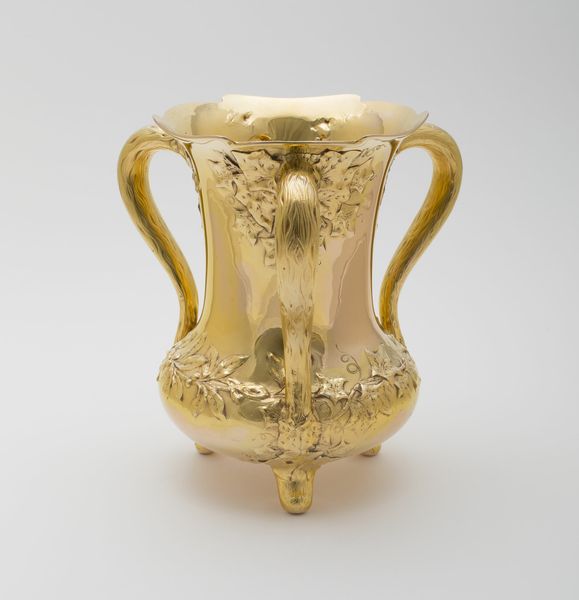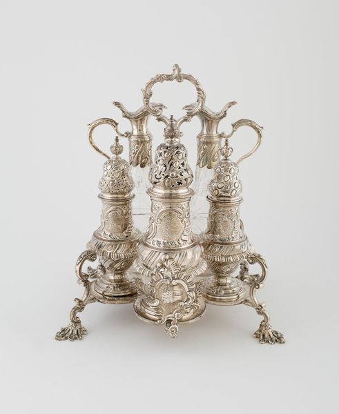 Curator: Let’s take a moment to observe this magnificent cruet frame, one of a pair, crafted between 1812 and 1822. It’s attributed to Jean-Baptiste-Claude Odiot, a master silversmith of the Neoclassical period. Editor: My immediate impression is of opulence; the interplay of gold, silver, and crystal is truly dazzling, though bordering on excessive. What exactly would one put in it? Curator: Traditionally, these frames would hold oil and vinegar. What’s fascinating to me is how Odiot has integrated symbolic meaning into the very structure of this functional object. Note the goddess figure. Editor: Yes, standing there draped. Given the era, one might assume it is Venus or similar classical archetype? How would that intersect with daily function, let alone social function? I’d say the labor necessary to extract, smelt, and work these metals suggests immense resources funneled toward creating these objects. It begs the question: For whom, and at what cost? Curator: Indeed, its extravagance points towards an aristocratic clientele, those for whom display was as essential as function. Semiotically, each element speaks volumes – the goddess embodies refinement, beauty and allusions to an idealized past, whereas, the silver, gold and even crystal reflects luxury and elevated status. Editor: Look at the griffins too. I wonder about the artisans, their skill certainly evident. It's quite important to acknowledge the socioeconomic dynamics involved in such commissions. From miners extracting the raw materials to the hands shaping the metal. Did Odiot dictate every detail, or did his team contribute? Curator: That’s an essential consideration – art always emerges from specific conditions, involving collaborative labour. Still, Odiot’s compositional mastery cannot be denied, in the symmetry and balance. Editor: Symmetry in service of…salad dressing. Food vessels rendered like divine objects feels absurd given our moment of reckoning on resource extraction. It feels tone deaf for the everyday object and luxury, to collide. Curator: Well, perhaps recognizing that tension is precisely how we can best engage with objects like these. Thank you. Editor: Indeed, hopefully, through critically examining the artistry, and means by which it became such, will help provide insight, and allow people to interpret it in modern times.