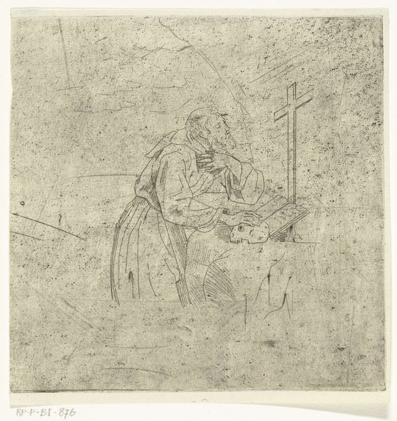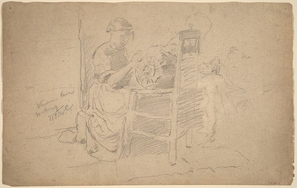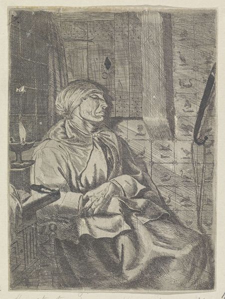 Editor: Here we have "Pannenkoeken bakkende vrouw," or "Woman Baking Pancakes," a pencil drawing on paper from the 1700s, currently residing here at the Rijksmuseum, by an anonymous artist. It’s mostly grey and seems very simple. What strikes me is how it shows such an everyday activity. What do you see in this piece? Curator: Indeed. At first glance, it’s a scene of domesticity, but look closer. The pancake itself. Pancakes are an almost universal food. Consider the *memories* and associations connected to this particular food, especially in Dutch culture, but spanning outward as well: family, warmth, home. See how the artist focuses on *this one* action: a kind of cultural continuity through shared experience, a powerful, emotional symbol. Editor: I didn't think of it that way at all! It felt more…mundane. So the artist chose a simple scene to evoke deeper, shared meanings? Curator: Precisely. Everyday actions become charged. Notice the candle. What does that tell you? It may evoke not just a cozy scene of family ritual, but potentially hardship or perhaps reflection within Dutch genre paintings, in which women are frequently placed as guardians of hearth and home, moral keepers. The composition and light enhance this emotional nuance and add subtle complexity to something you described as “simple”. Does it strike you differently now? Editor: It does! Seeing the layers of symbolism— the food itself, the light—makes me appreciate how even seemingly straightforward images can resonate with historical and cultural depth. Thanks for pointing those out! Curator: It’s in decoding these visual cues, understanding the collective memory embedded in the image, that we enrich our connection to the art and to one another, isn’t it?