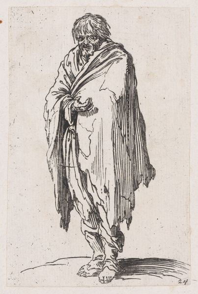 Editor: This is Jacques Bellange’s “Melchior, from Three Magi series,” made sometime between 1595 and 1616. It's a print, and the figure, seen from behind, has this extravagant costume…it’s so theatrical. What exactly am I looking at here? Curator: A performance of power, wouldn’t you say? Consider the context: Bellange worked for the court of Lorraine, a place steeped in spectacle. The image wasn’t just about religious narrative; it was a demonstration of wealth and taste, disseminated through prints. This “Melchior” becomes an emblem of aristocratic style. Editor: So it's not necessarily about sincere religious feeling? Curator: Perhaps. The Mannerist style—the elongated form, the ornate drapery—it all contributes to this sense of heightened artificiality. It is hard to see Melchior, and perhaps the very notion of religious piety itself, beyond the sheer display of visual artistry and the court's cultivated aesthetic. How would this image circulate? Who saw it? What did it signify for different viewers? Editor: So the print functions almost like a fashion plate of the time, circulating within a certain social sphere and dictating a kind of visual language. Curator: Exactly. It speaks to how art served to construct and reinforce social hierarchies. Think of the costume: not only a garment but an advertisement of privilege. These prints allowed nobles all across Europe to perform devotion in the most modern fashion. Editor: I guess I was focusing too much on the supposed religious meaning and missed the whole point about it being part of courtly culture! Thanks for untangling that. Curator: It’s a valuable lesson. Art, particularly in historical contexts, is so often about how imagery performs social work, beyond its apparent subject.