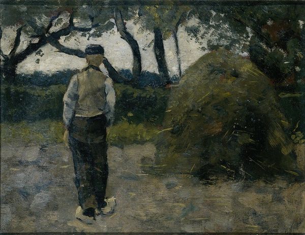 Édouard Vuillard made this painting of a couple in a verdant landscape with oil on canvas. Vuillard was deeply interested in the material properties of paint, using its viscosity to evoke the sensuousness of the scene, and applying it in ways that mirror the tactile qualities of everyday life. Look closely, and you can see how Vuillard built up layers of pigment, almost like wallpaper being applied to a wall, an effect that stems from his training as a stage painter. The brushwork, although seemingly casual, is actually carefully considered to capture the fleeting effects of light and shadow, conveying an intimate moment shared between two figures amidst the backdrop of nature. This emphasis on the material and the act of making invites us to consider the work involved in the production process, and encourages us to appreciate the skill and artistry involved in rendering such a commonplace scene into a compelling visual experience.