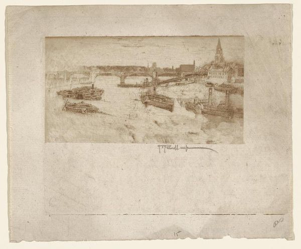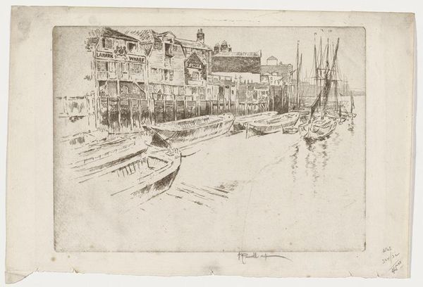 Curator: Joseph Pennell’s “St. Pauls Wharf,” created in 1884, is an etching that offers a striking glimpse into the London cityscape. Editor: Immediately, I’m drawn to the contrast. It’s like the grand cathedral looming in the background almost mocks the gritty reality of the working waterfront in the foreground. Curator: That’s a wonderful observation. Pennell really captures the duality, doesn’t he? Consider the process itself: the meticulous etching, biting into the metal, feels like it mirrors the industrial wear and tear of the wharf he's depicting. Think about the sheer labor involved. Editor: Absolutely! And look at the lines. There's a delicacy, a precision in the way he renders the architecture, the rigging of the boats, yet everything feels almost ephemeral, like a memory. Is it just me or is there melancholy in the air? Curator: There is. Etchings like these often served as both documentation and commentary. What materials were being transported along that river, who was laboring on those docks? I’m thinking about empire, and production… the less romantic stuff! Editor: True. But look past the industrial and the cathedral... there's an echo of Whistler, I think, in that almost dreamlike quality of light and shadow. A reverence for the ordinary made extraordinary through observation and skill. Don't you feel like you can almost smell the salt and the coal smoke? It makes one reflect. Curator: I suppose it is Pennell trying to romanticize it, not dissimilar to photography. Perhaps that is what appeals, however… even with the focus on commerce it holds something akin to… truth, beauty? Something more, nonetheless. Editor: Well said! Truth and beauty wrestling in the mud of the Thames. Ultimately, this etching invites us to ponder the multi-layered reality of London then…and now, when these power structures are very much the same.