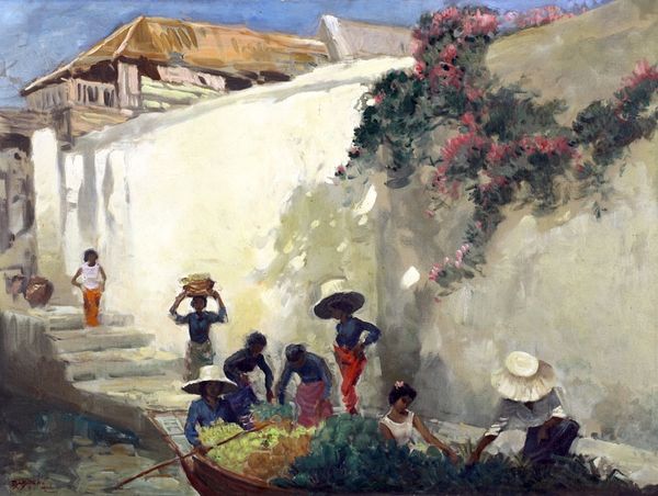 Editor: This is Basuki Abdullah’s "The Fruit Market," and although undated, it feels like stepping into a warm, bustling marketplace through an Impressionistic lens. It is an oil painting of an outdoor tropical market. The fruits almost spill out of the painting! I find myself drawn to the parasols. What catches your eye and how do you interpret this work? Curator: Oh, those parasols, absolutely! They’re like vibrant, protective haloes over this scene, aren’t they? For me, the magic lies in how Abdullah captures the sensory overload of a market: the aroma of ripe fruit, the lively chatter, the visual feast of colors. The strokes are so loose, so full of light – it’s like trying to hold onto a fleeting memory, that moment when reality bursts with life. Editor: I hadn’t thought about it as a fleeting memory. Curator: Think about the Orientalist style here too. How does Abdullah blend that with Impressionism? Are we seeing a romanticized version of Southeast Asia, or is there something deeper happening? Do the impressionistic strokes help us see the mundane differently, almost elevated, and maybe even blur the lines of who this is painted for? Editor: That’s such a good point about the audience and orientalism! Curator: What’s especially clever is the way Abdullah uses color to evoke not just what's visible, but the felt experience of the marketplace – the energy, the vibrancy. And do you notice the way he uses those touches of white paint? Almost like sparks of light dancing across the scene… it makes everything feel so alive. Editor: Definitely! I see those white sparks everywhere now. It feels less static and more immersive, almost as if the painting breathes. I've never quite understood the impact of impressionistic brush strokes, but you've provided new meaning for me to appreciate. Thank you. Curator: Anytime! It's through fresh perspectives like yours that we really start to see these pieces anew, and uncover new conversations to be had.