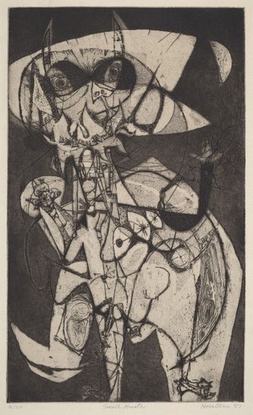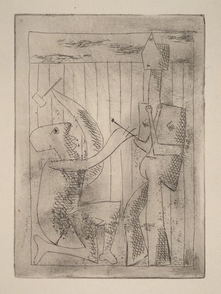 Editor: Here we have Imre Reiner’s “Von Kleist/Marionettentheater,” made in 1964, a print created using etching and ink. The stark lines against the blurred background create such a fascinating tension. How would you interpret this piece? Curator: As a materialist, I'm drawn to how Reiner utilizes the etching process itself to convey meaning. The lines, seemingly crude and spontaneously applied, belie a carefully considered process, don't you think? The visible labor that goes into printmaking highlights the human hand, almost mimicking the control and construction inherent in the puppet theater itself. Editor: That's an interesting point. I was just focusing on the visual appearance, not necessarily the labor or artistic processes to realize it. I suppose that the artist needed to make the print multiple times to give it this kind of chaotic expression? Curator: Precisely! And consider the materials—the etching ink, the paper itself. They are humble, everyday materials, yet they become the vehicle for expressing profound themes. What I find particularly intriguing is how the blurring challenges the traditional boundaries between drawing, print and painting by emphasizing texture and tone with a relatively simple set of materials. The matrix almost doesn't matter; this blurring makes it seem like the ink is floating atop of the sheet of paper. How does that make you feel about the work's relationship with art? Editor: So you're suggesting that it undermines traditional, hierarchical views of artistic value based on medium and execution? That art should be evaluated upon expression rather than by method of fabrication or the preciousness of the material? I agree, I definitely see that now. Curator: Exactly. Reiner isn't just depicting puppets, he's engaging in a conversation about the very nature of creation and control through his unique artistic practice and careful exploitation of materials. It's an intriguing statement on materiality and artistic vision. Editor: This really makes me appreciate the choices of printmaking! I'll definitely be looking at art with an eye toward how it was produced.