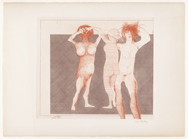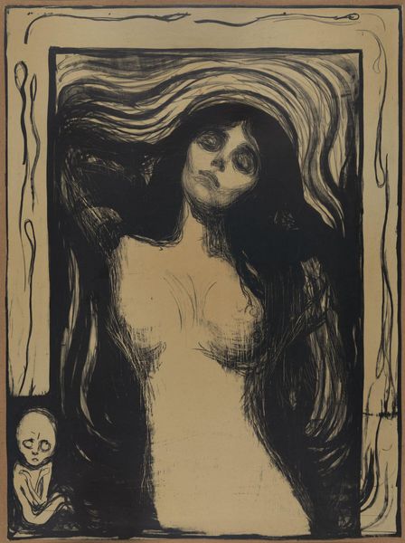 Curator: Here we have Edvard Munch's "Woman", currently residing at the Harvard Art Museums. The dimensions of the image are roughly 46 by 59.5 centimeters. Editor: It hits you hard, doesn't it? Like a primal scream trapped in monochrome. The way the figures emerge from the darkness is both haunting and alluring. Curator: Indeed. The composition directs the viewer's eye across three distinct female figures, each seemingly representing different facets of womanhood—shadow, sensuality, spirit. Editor: I'm drawn to the central figure, arms raised, almost defiant. She's like a flame refusing to be extinguished by the encroaching darkness on either side. Curator: Note how Munch manipulates light and shadow, creating a palpable sense of tension and psychological depth. The stark contrasts emphasize the vulnerability and power inherent in the female form. Editor: It’s amazing how he manages to distill so much emotion into such a simple palette. It is a raw depiction of human emotion. Curator: Absolutely. It's a masterclass in visual storytelling, inviting us to contemplate the complexities of identity and experience. Editor: Well, it definitely gives you something to chew on, doesn't it? A little bit of beauty, a little bit of terror, and a whole lot of questions.