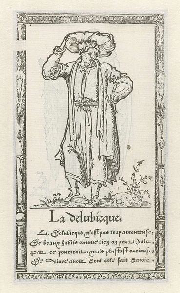 Editor: So, this is "Man with Shield and Axe" by François Desprez, from 1562. It's an engraving, and what strikes me first is how meticulously detailed the lines are, especially considering the small scale. He looks almost theatrical. How would you interpret this work? Curator: It's crucial to look at how these kinds of images functioned within their historical and social context. The figure, labeled "Le barbare" or "The Barbarian", needs unpacking. It’s unlikely that Desprez was simply creating a portrait. Rather, prints like this often served as social commentary, categorizing people based on perceived cultural characteristics. Consider, for example, the deliberate juxtaposition of the term 'barbarian' with the ornately decorated border and text proclaiming admirable qualities. What tensions do you see arising from this? Editor: I see that contradiction, absolutely. It's like the image is setting up this expectation of savagery, but then complicating it. He's got this wild look, but he's also rather carefully dressed. The poem at the bottom uses elevated language too! It reminds me a bit of period costuming for a play. Curator: Precisely. Think about who these prints were for. This would have been consumed by a specific audience – educated, probably urban. These kinds of representations reinforced certain social hierarchies and ideas about otherness, both within Europe and beyond. What role do you think images like this played in shaping popular perceptions of people and cultures deemed "barbarian"? Editor: That's such a good question, it puts it into a power dynamic, showing these assumptions embedded in the culture itself through artworks that now seem archaic. I never considered the social impact beyond the art itself before. Curator: Indeed, prints circulated widely, becoming tools for propagating and solidifying such perspectives. So while the image itself might seem like a curious artifact, it represents a much larger cultural framework. Editor: Well, this image gave me an entirely different point of view on how socio-political ideas and artworks connect, it’s a complex entanglement, to be sure! Curator: Exactly, now you're beginning to see the political weight images can carry!