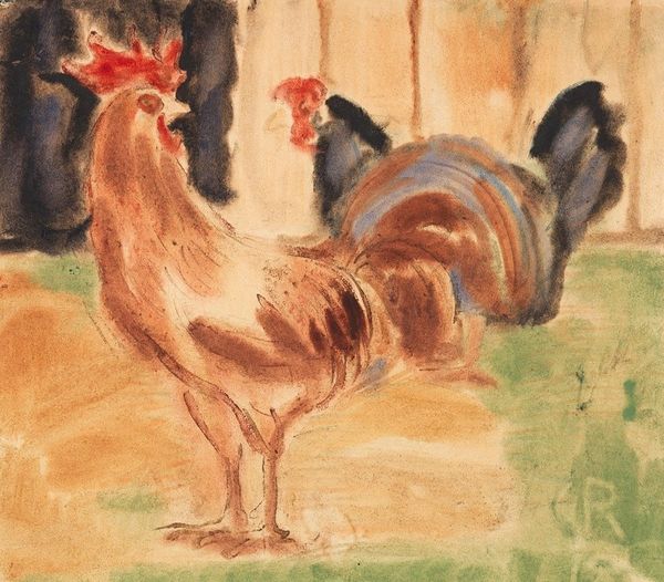Maurice Pillard Verneuil made this print called "Coqs et poules" sometime in the late 19th or early 20th century. Verneuil was a French artist deeply embedded in the Art Nouveau movement, which sought to integrate art into everyday life, often drawing inspiration from the natural world. The print presents us with a pastoral scene of roosters and hens. It reflects the aesthetic values of the period, but it also subtly engages with societal expectations around gender and identity. The roosters, with their vibrant plumage and proud stances, might be seen to embody traditional masculine ideals of strength and dominance. Meanwhile, the hens, depicted in more muted tones, seem to represent a quieter, nurturing femininity. Yet, Verneuil complicates these readings through his artistic style. The animals are stylized, almost ornamental, which disrupts any straightforward interpretation of gender roles. The composition feels balanced and harmonious; perhaps suggesting a world where these identities coexist. Ultimately, this print offers a delicate balance of visual pleasure and understated social commentary, inviting us to consider the roles we all play.
