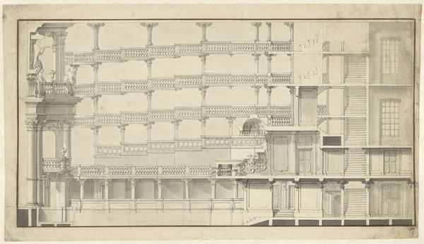 Giuseppe Galli Bibiena rendered this drawing, "Elevation of Boxes and Royal Box as Presently Constituted and According to New Design," with pen and brown ink, brush and gray wash, over black chalk on off-white paper. The drawing depicts the elevation of theater boxes, contrasting their current state with a proposed design. The level of detail suggests that Bibiena was not merely sketching ideas, but rather presenting a carefully considered plan. The contrast of styles, from a more sober, classical style to an elaborate Rococo design, indicates changing tastes and a desire for modernization. Such theatrical designs were crucial for shaping social experiences. The boxes weren't just for viewing plays; they were spaces for display, negotiation, and social distinction. This drawing shows how much work goes into orchestrating a hierarchy of taste. It is a reminder that cultural production is always enmeshed with political and economic power.