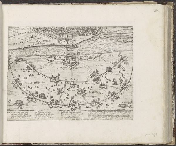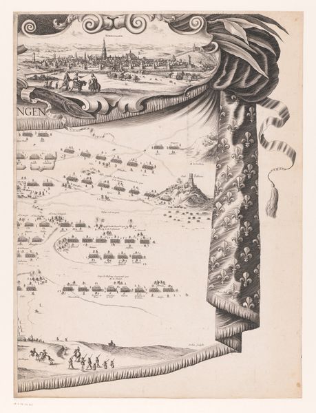 This is a detailed rendering of the left section of "Opstelling van het leger bij slag bij Nördlingen," created by Nicolas Cochin. The detailed etching captures a bird's-eye view of a battlefield, its composition split between a townscape at the top and the regimented lines of troops below. Cochin masterfully employs linear perspective and miniature detail to convey depth and breadth. The stark contrast between the densely populated city and the ordered military formations introduces a tension between civilian life and the calculated structure of warfare. The flag creates a semiotic relationship to interpret the cultural codes of 17th century military strategy and social order. The engraving, with its sharp lines and organized layout, reflects the period’s interest in categorizing and understanding the world through mapping and documentation. It challenges fixed notions of space and representation, offering new ways of perceiving power and order.