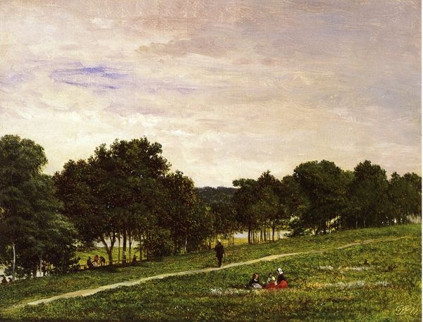 Editor: Here we have Eugène Boudin’s “Parc Cordier in Trouville,” painted sometime between 1880 and 1885, with oil on canvas. The casual elegance of leisure depicted here strikes me immediately. What do you see in this piece from a historical perspective? Curator: Boudin gives us a snapshot of bourgeois leisure in late 19th-century France. Look at the clothing, the parasols, and the very act of strolling through a park. It speaks to the increasing availability of leisure time for a specific social class. What I find particularly interesting is how Boudin captures this without idealizing it. Does it feel like propaganda for this lifestyle? Editor: Not really, it feels very...observed. He's documenting a scene, not selling it. Curator: Exactly. And that observation has historical weight. Boudin, like many Impressionists, was concerned with depicting modern life. This park scene reflects the rapidly changing social landscape of the time. Think about the rise of the middle class, the growth of cities, and the development of public spaces designed for leisure. It also raises questions of access. Who could afford the clothes, the time, to be in this park? What message does it send about wealth, privilege, and public space in this era? Editor: So, in a way, even a seemingly simple landscape painting becomes a commentary on the social and political realities of the time. I didn't see that initially! Curator: That's the power of historical context! By examining the social, cultural, and economic conditions surrounding a work, we gain a much deeper understanding of its meaning and significance. These parks, in themselves, became stages for performances of class, where social mobility and aspirational identity played out. Editor: It gives a whole new layer to what seemed at first like just a pretty scene. Thanks for opening my eyes! Curator: My pleasure. Considering art as part of the social and cultural fabric helps it become more relatable and important, connecting historical forces to lived experience.