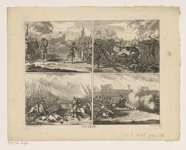 Johann David (I) Schleuen created this print, "Vier encyclopedische voorstellingen," sometime in the 18th century. The Enlightenment was in full swing in Europe, characterized by a surge in scientific inquiry and encyclopedic efforts to classify all knowledge. Each of the four scenes encapsulates different aspects of the natural world, from a couple riding a lion through stormy waters to an image of people walking with a dog in an open landscape. The way the images are organized, juxtaposing different elements of the world, leads to a certain degree of tension and contemplation. There's a sense of humanity trying to understand its place within these vast natural systems. These images ask us to consider our relationship with nature – how we perceive, interact with, and represent it. They reflect the period’s drive to categorize and rationalize the world, but also hints at the sublime power of nature. They remind us of the complexities and contradictions inherent in our quest for understanding.