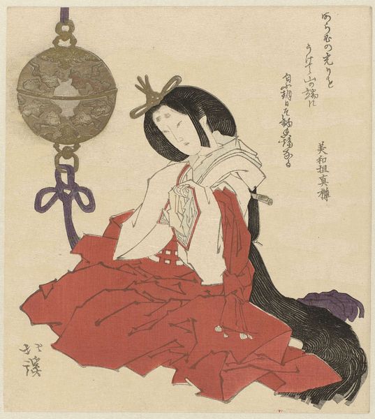 Editor: This woodblock print from the Rijksmuseum, “Vrouw met wierookbrander,” made by Totoya Hokkei around 1800 to 1850, is so serene. I’m really drawn to the bold blocks of flat color, especially the woman's bright red garment. How would you approach interpreting a piece like this? Curator: From a materialist perspective, it's crucial to consider the labor involved in its production. Think about the process of creating a ukiyo-e print – the carving of the woodblocks, the layering of ink, and the role of the artisan in translating the artist's vision. Who was consuming these prints, and how did their social status influence the demand for particular subjects and styles? Editor: So, beyond just the aesthetic, it’s important to understand the economic and social structures that made the print possible. I never thought about it that deeply! Curator: Exactly. We might also examine the symbolism of the incense burner itself. What material is it made from? Its shape, and the act of burning incense all point to a specific ritual or tradition? Are we seeing an idealized depiction, or a more realistic portrayal of daily life? Editor: That makes me wonder about the availability and cost of these materials. It wasn't just about the skill, but also who had access to what resources and knowledge. Curator: Precisely! By questioning the conditions of its creation and reception, we gain a much richer understanding of the artwork’s meaning. It challenges us to see the connections between art, labor, and consumption in Edo-period Japan. Editor: This really shifts my focus. I see how this approach reveals the intricate social dynamics embedded in even seemingly simple images. Thanks for shedding light on this, Curator!