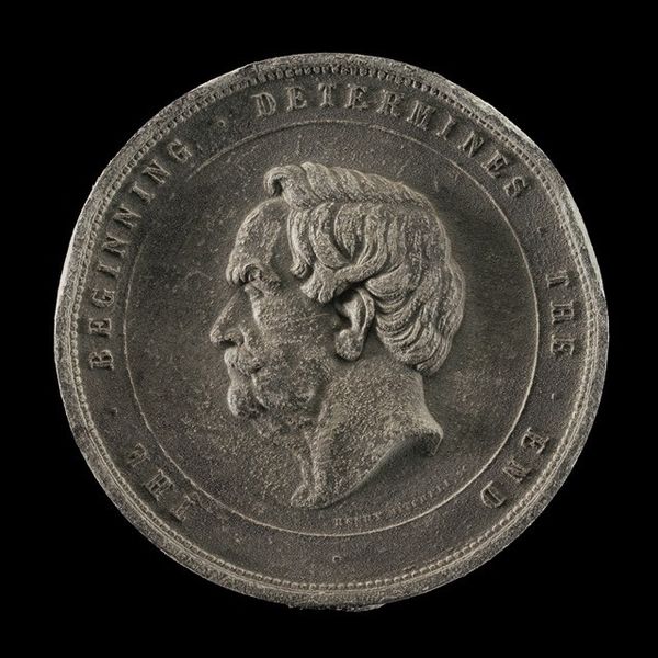 Curator: Here we have a medal sculpted by Massimiliano Soldani in 1684, which currently resides in the Metropolitan Museum of Art. The medal depicts Francesco Redi. Editor: The first word that comes to mind? Intricate. The level of detail on such a small surface is breathtaking. The hair alone… it looks like spun moonlight. Curator: Indeed, the piece showcases Soldani's mastery of the baroque style in miniature form. Notice how the light plays across the metal relief, accentuating the texture and depth of the portrait. Editor: The profile view lends an air of solemnity, wouldn’t you agree? It almost feels like catching a glimpse of him deep in thought. And those cascading curls! It’s like he’s captured the wind in metallic form. Curator: The inscription around the edge – FRANCISCUS REDI PATRITIUS ARETINUS – identifies the sitter and his noble lineage, providing historical context for the piece. It functions both as identification and glorification. Editor: Makes you wonder about Redi himself. What stories would he tell? Judging by the artistic quality here, clearly someone considered important enough to immortalize. Was he as serious as the metal suggests, I wonder? Or did he have a playful side, hidden beneath those meticulously crafted curls? Curator: While we can only speculate on Redi's personality, this medal serves as a valuable artifact, speaking to the artistic and cultural values of the time, the techniques that informed artistic interpretation of historical subjects. Editor: It’s more than just historical record, though. It’s a tiny time capsule. To hold it would be to connect with a moment, with Redi himself… albeit through a cool piece of bronze. What survives of us, eventually, no? Curator: Ultimately, this metal artwork serves as a testament to Soldani’s remarkable skills as well as a window into the 17th century Florentine society, providing an echo from the world as it was. Editor: Agreed. Art reminding us we exist, we matter, we pass. Metal whispers of mortality; what could be more perfect?