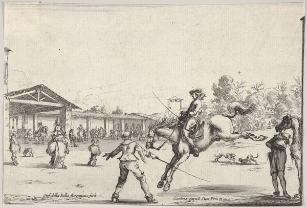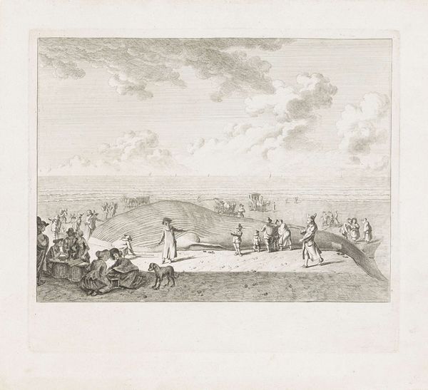 Editor: This is "Sneeuwballengooiers," or "Snowball Throwers," an engraving by Anthonij van der Haer, created sometime between 1745 and 1785. It depicts figures on a frozen landscape engaged in winter activities. I'm immediately drawn to the sense of playful energy amidst the cold. What strikes you most when you look at this print? Curator: Ah, yes, the simple joys of pelting someone with a frozen sphere! It takes me back, doesn’t it you? The piece isn't just a charming scene, but a time capsule. Notice the detailed rendering of the clothing; it’s a snapshot of everyday life for people in that period. Beyond that, the figures populating the backdrop suggest all walks of life mixing on a frozen stage. A landscape united in its chill. Tell me, what do you think this work says about community in the Baroque Era? Editor: That's interesting; I hadn't considered the social aspect so directly. It seems to imply a casual interaction amongst different social classes, perhaps more so than during other times of the year. Could the frozen landscape itself be a symbolic equalizer? Curator: Precisely! Think of the rigid social structures of the time. The ice, almost a blank canvas, allows for a temporary disruption of those structures, and for connections –even through a snowball fight– to flourish. The artist invites us to reflect on a shared humanity that momentarily transcends societal constraints. It is a refreshing notion, like that first blast of winter air. Editor: I never would have thought about that. I was too distracted by the…snowballs. Thanks, now I am wondering about the socioeconomic status of each figure! Curator: Always a fun avenue to consider. Keep questioning. It keeps art alive, just like that first snowball of winter!