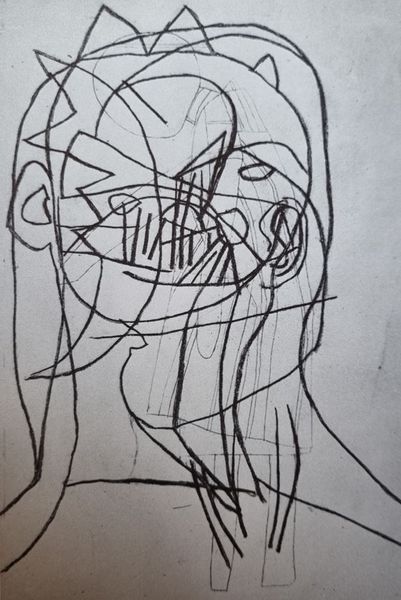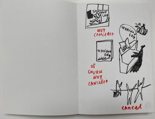 Curator: Here we have Alevtyna Kakhidze's "Untitled. Strawberry Andreevna" created in 2019. It appears to be an ink drawing, perhaps from a sketchbook. Editor: The raw, unfiltered energy jumps right out! The bold, dark blob at the bottom grounds the scene. Is it a shadow, or something more sinister lurking beneath? Curator: Knowing Kakhidze's work, the setting likely alludes to sociopolitical issues in Eastern Europe. The presence of what seems to be a specific flag could be pointing towards an ongoing conflict and its effects on domestic life. Editor: Yes, there's definitely something disquieting. The simple lines contrast sharply with the dark mass at the base. The house feels confining. Note the character inside seems surprised. The line work of the walls seems almost… fragile. Curator: The house motif often represents stability and the personal sphere. With the flag on top of the building, we can ask to what extent that stability is maintained. Consider how the simple style could relate to a personal, perhaps even autobiographical narrative. Editor: I find the minimalist approach striking. Just a few lines, but they convey a lot of meaning. Note the use of blank space to enhance the dreamlike or anxious mood of the figure depicted here. Curator: The use of 'Strawberry Andreevna' in the title gives the work a personalized and almost documentary feel. It connects abstract social issues to lived, individual experience. This humanizes the work, offering insights on local experiences for audiences abroad. Editor: Right, the title personalizes what could be a general narrative. The composition is raw but purposeful in achieving the intended effect: simplicity amplifying the weight of displacement, anxiety and even fear. Curator: Kakhidze prompts the viewer to question notions of home and belonging during times of geopolitical instability. These sketchbook-like works can act as critical commentaries. Editor: I concur! Its stripped-down essence concentrates a formidable message, hinting at personal vulnerabilities, anxieties and conflicts beneath the surface of apparent ordinariness.