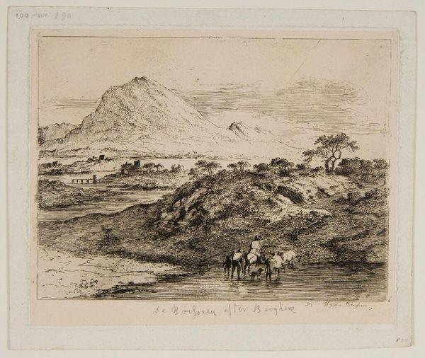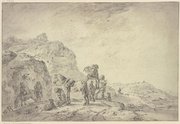 Friedrich Preller the Elder created this Italian landscape with graphite on paper. At first glance, the composition, dominated by horizontal lines and muted tones, evokes a sense of stillness and classical calm. Preller’s use of line is particularly striking. Notice how the delicate, precise strokes delineate the forms of the figures, cattle, and the distant mountains, creating a layered effect that draws the eye into the landscape. The structure here is one of carefully balanced contrasts: the detailed foreground against the hazy background, the organic shapes of the animals against the geometric lines of the boat and ruins. This interplay between precision and ambiguity invites a semiotic reading of the artwork. The landscape elements—the river, mountains, and ancient ruins—can be seen as signs representing the passage of time, the relationship between humanity and nature, and perhaps, the enduring presence of the past. The image doesn't offer a singular, fixed meaning. Instead, it serves as an open field for interpretation. Consider how Preller masterfully uses the formal elements of line and composition to engage us in a visual and intellectual dialogue.