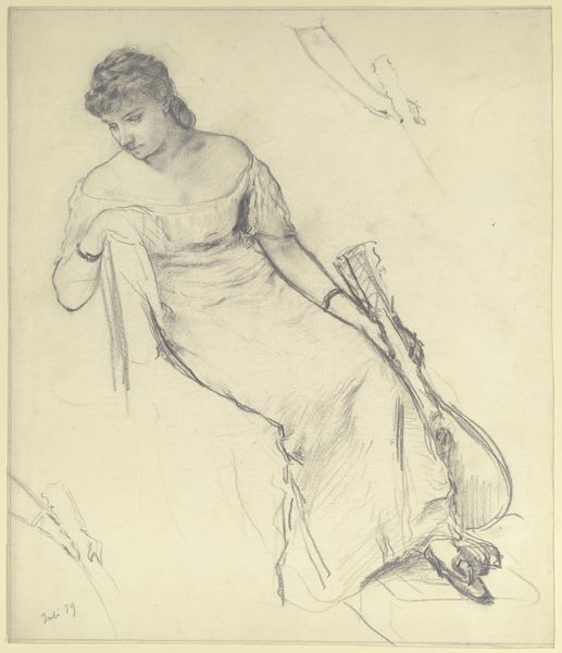 Otto Scholderer made this delicate pencil drawing, *Seated Woman with Mandolin*, in 1879. Drawn during a time of significant social change across Europe, as traditional class structures were slowly starting to shift. The image presents a young woman, seated and holding a mandolin, a symbol of leisure and refinement. Consider the role of women during this era, often confined to domestic and decorative roles. Here, the woman’s gaze is directed downwards, almost introspective, hinting at the complex inner life of women whose external freedoms were limited. The use of the mandolin brings up questions about cultural identity and performance. Was music a form of expression, resistance, or simply a display of social grace? Scholderer captures a moment that speaks to the constraints and the quiet rebellions within 19th-century bourgeois society.