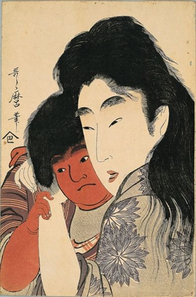 Curator: Here we have Kamei Tôbei’s “Puppet Woman’s Head,” a print that entered the Harvard Art Museums collection. It captures a moment of traditional Japanese puppetry. Editor: Immediately, I'm struck by the contrast. The delicate, almost ethereal face against the coarse, grounded hands creates a dynamic tension. Curator: Tôbei was working in an era where traditional arts struggled against Western influences. This print, in a way, is an argument for the continued relevance of Japanese theatrical forms. Editor: Yes, and the flatness of the print enhances the doll-like quality, doesn't it? The stark lines, the simplified features... it's almost a meditation on artifice. Curator: Perhaps. And it's important to remember that puppetry itself has always been a platform for social commentary, a way to voice dissent through ostensibly harmless entertainment. Editor: Indeed. The work really resonates, provoking questions about performance, identity, and the roles we play. Curator: Very insightful. It’s a privilege to consider the lasting impact of this piece.