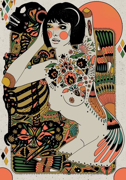 Cassidy Rae Marietta created this artwork, Kindred Spirit, in the 20th century. Its vibrant, earthy tones are immediately striking, framing the central figure in a soft, warm glow. The composition is carefully structured, with a symmetrical border of floral motifs enclosing a serene nude figure draped in richly patterned fabric. The lines are crisp and deliberate, lending a graphic quality that balances the organic forms of the flowers and the human body. Marietta skillfully uses color to create depth and texture, playing with contrasting shades of orange, green, and pink to draw the eye across the surface. There is a strong sense of symbolism here, using the natural world to celebrate the human form. The motif of the ‘third eye’ throughout the composition, and the nude figure bathed in light, evokes an almost mystical atmosphere. This artwork becomes an invitation to explore the interplay between the visible and the unseen, questioning our relationship with the natural world.