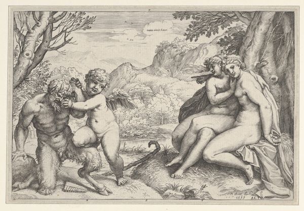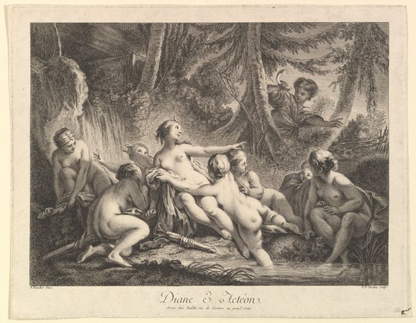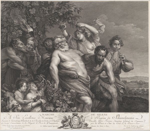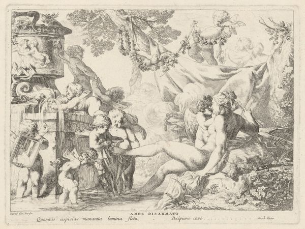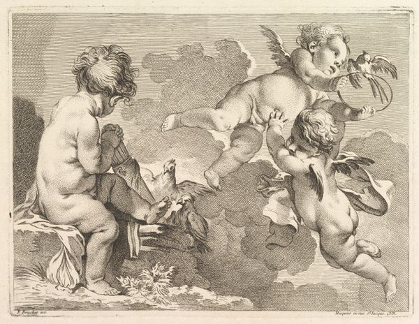 Curator: Look at this delightful 18th-century engraving, "Seven Putti Carrying a Garland of Fruit," attributed to Heinrich Schmitz. The original artwork is housed right here at the Metropolitan Museum of Art. What catches your eye first? Editor: Immediately, the sheer physicality of it! You've got these plump little cherubs clearly struggling under the weight of this enormous garland. It speaks volumes about labor, even in the realm of idealized beauty. Curator: Precisely! It's interesting to consider what that labor actually entails, artistically and symbolically. The garland itself, overflowing with grapes, apples, and other fruits, is a traditional symbol of abundance, harvest, and earthly delights. Do you think there are any social implications of how these specific cherubic figures are involved? Editor: Absolutely. It makes me think of the broader societal context. I mean, who gets to enjoy this abundance, and who bears the weight of its creation? The engraving process, itself—etching, labor and consumption are intertwined, too. Curator: It’s an interesting thought when we relate it to the baroque artistic style. And how the putti have varying facial expressions and levels of exertion. One's almost slipping, which is unusual, because often artworks want to idealize such laborers, no? Editor: And they seem oddly isolated even with all this contact between them as they transport this absurd harvest, if it really existed in the real world. They seem cut off by that labor, their expressions so determined and a little pained... The contrast makes you question the easy joy of Baroque aesthetics. Curator: Perhaps that tension adds to its staying power. So what do we take away from it after we have discussed the material and its allegorical context? Editor: It pushes us to look beneath the surface. To ask: Whose labor makes beauty possible, and at what cost? It brings an important dimension. Curator: I concur. The layers within are delightful. A true abundance for the mind, too, then.