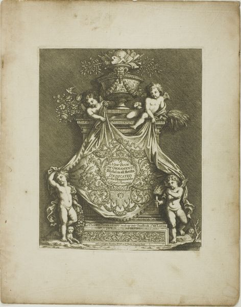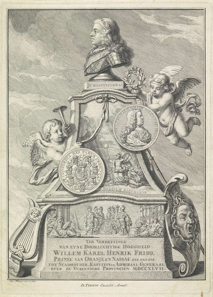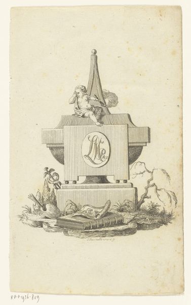 Curator: Here we have J.F. Clemens’ “Hæders Minde for d. 2 April 1801,” an etching that appears to have been completed sometime between 1748 and 1831. Editor: Immediately, I'm struck by its serene stillness. The scene almost feels like a delicate dream. There is this profound sense of loss, maybe it's all the monochromatic line work? Curator: Indeed, the emphasis on line contributes significantly to the overall effect. Notice how Clemens employs varied densities to define form and shadow, achieving depth despite the print's inherently flat nature. Observe, also, the carefully constructed composition with the allegorical figures flanking the central monument. Editor: The monument feels rigid, stoic almost. It’s flanked by these elegant figures, but weighed down by an elaborate flag. It makes you wonder about the event the monument is commemorating—what inspired such mixed feelings in the creator? It’s somber, but not without this neoclassical polish and grace. Curator: It commemorates the Battle of Copenhagen on April 2, 1801. The figures, rendered in neoclassical style, embody allegorical virtues relevant to the battle. The monument inscription reinforces this. Editor: Right. Now I see how this isn't just pretty picture. These figures, likely representing Liberty and Remembrance, stand guard over a pivotal, blood-soaked moment in history. I notice now the children at the base. They almost appear to be adorning the structure in memoriam, which further humanizes the historical event. Curator: Precisely, and their actions introduce a cyclical element to the narrative. We see remembrance passed down through generations. Structurally, the symmetry offers a balanced, controlled vision befitting the neoclassical style. Editor: Knowing what this image represents, I see it as more than just pretty aesthetics. It captures an elegiac quality of remembrance—even beauty emerging from moments of upheaval and discord. I wonder if we will ever evolve past that sort of violent moment into creating art that reflects peace. Curator: Clemens, through masterful execution of line and form, invites us to consider how art can act as both a record of, and a meditation on, human events and the forces that shape them.