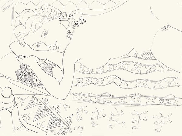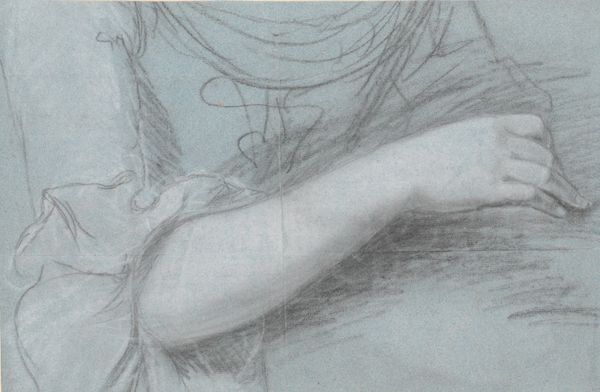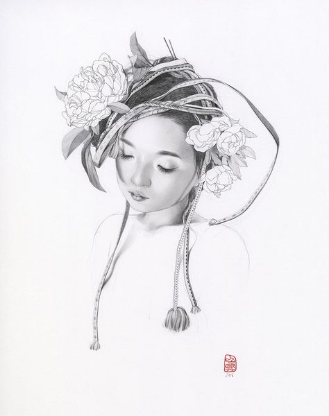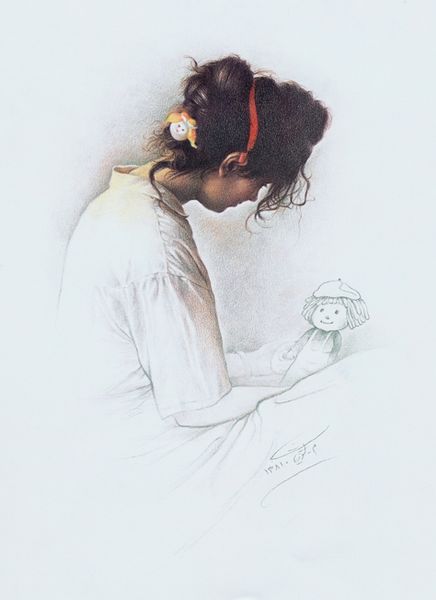 Curator: Here we have Soey Milk's 2018 drawing, "The Dawn Watering," a title that suggests the themes of growth and renewal that are present throughout Milk’s work. Editor: It’s so delicate, almost ephemeral. The grayscale rendering contributes to this sense of gentle, dreamlike tranquility. Is it pencil or charcoal? The light seems to be its primary material. Curator: Indeed, her work is defined by graphite pencil drawing, allowing for these gradients and wispy, delicate lines. She focuses on creating a scene, staging it with real people. This process and then using social media for audience reception makes it different than just realism. Editor: Look at the subtle motifs throughout. The stars—or are they blossoms?—on the pillow and blanket are such a clear image of freshness and budding potential. Her hair merges almost seamlessly into the fabric; even her own hand echoes those blooming shapes. There's an intense continuity here. Curator: I’m interested in that hand though. It enters the frame disembodied, interrupting the portrait. What does this disruption say about the traditional subject? It may be symbolic of art viewers who appropriate the image in an age of rapid image consumption. It’s about art and its influence and about access to our dreams in general. Editor: I hadn’t considered the external imposition on the intimate dream-space. To me, it also echoes classical gestures in iconic works, pointing towards an ideal of feminine beauty—but there’s something very melancholic in how the woman turns away. It is not overtly staged. The red chop marks almost look like stains of pigment, but it pulls you out to confirm its material. Curator: Exactly. We see the clear traces of production as we move away from the ideal, but now I understand it on both of our terms: material and sign. Editor: Yes, the blend of tradition with modern themes truly gives it layers, doesn't it? Curator: I quite agree, an accessible yet thought-provoking work.