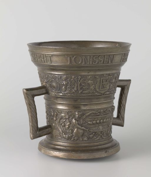 Curator: Looking at this robust bronze mortar from 1581, I can’t help but feel grounded by its geometric stability and classical air. Editor: I am immediately drawn to the lively figures encircling the midsection – are those dancing children, or perhaps allegorical figures in motion? They infuse an element of playful chaos into an otherwise serious form. Curator: Indeed. Created by Thomas Both, this object—entitled “Vijzel met opschrift: SEBASTIAEN VAN GEERSBEGE 1581"—bridges the mundane with the sacred. The inscription, bearing a name and date, monumentalizes a particular time, maybe marking a significant family event or even a community milestone. Editor: The choice of bronze itself carries weight. Bronze suggests longevity, permanence. It's not a fleeting material; it is intended to endure. Consider the patina – each shadow is telling a new story of use and age. Curator: Precisely, bronze inherently connects to age-old associations; it’s been charged with historical power since antiquity. And mortars, utilitarian objects by design, also evoke something of the alchemical—the potential for transformation through the mixing and grinding of materials, medicinal or otherwise. They bring the past to life and transform our relationship with even daily materials. Editor: You are absolutely correct. Form and function unite to elevate it from mere vessel to cultural signifier. A reminder that everything we see and use carries its own story within its texture. I'm seeing so many tiny geometries in this relatively simple item. Curator: In short, the artwork embodies the era that created it, transforming function into historical permanence. Editor: For me, it's in the contrast between the classical, almost rigid shape, and that flurry of figures caught in perpetual motion—a moment of controlled joy in the heart of somber bronze.