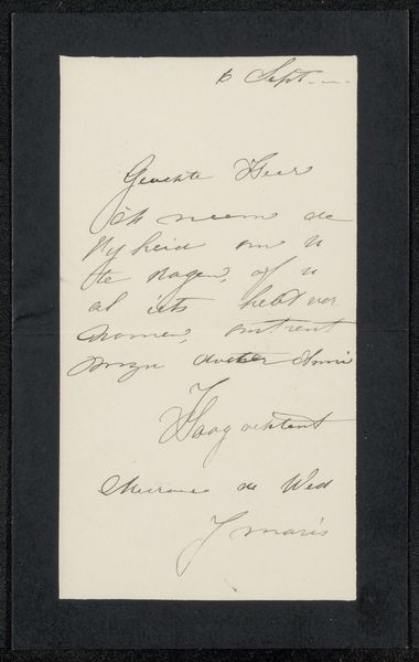 Editor: Here we have "Brief aan Pieter Verloren van Themaat," made sometime between 1840 and 1892, artist Pieter van Wessem. It is a drawing with pen on paper. Initially, the contrast between the fine script and the stark background really grabs me. What stands out to you from a structural standpoint? Curator: The composition itself presents a fascinating tension. The eye is immediately drawn to the sweeping curves of the script, which dominate the visual field. However, note how the even spacing between the lines and the consistent weight of the pen strokes establish a rigorous, almost architectural structure beneath the seeming fluidity. It's this interplay between spontaneity and control that commands attention. Editor: That makes me think about how handwriting itself is a form of drawing. Do you see any other relationships at play? Curator: Absolutely. Observe the paper’s texture, seemingly smooth. The texture creates subtle tonal variations and catches the light differently, thereby adding a layer of visual interest. This reminds us of drawing not only as an act of writing but also as mark-making that uses materiality itself as meaning. Editor: So, you're suggesting that the choice of paper impacts the expressive qualities of the letter? Curator: Precisely. Every element, from the precise angles of the ascenders and descenders in the handwriting, the careful ordering of words, all combine to form meaning, separate from content. These details create a powerful visual and tactile experience for the viewer. Editor: I never would have considered all the elements until now, like the texture or consistency between the writing. Curator: Examining art from this point of view often reveals complexities previously unseen. We discover new perspectives that significantly enrich how we comprehend and encounter artworks.