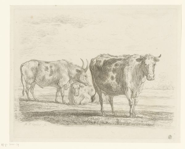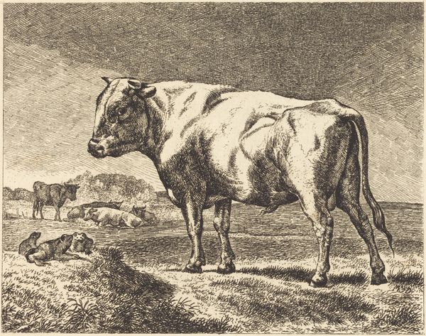 Karl Bodmer created this etching called "Bulls" as part of his "Eaux-Fortes Animaux & Paysages" series. The composition is strikingly divided between the sharp, detailed foreground and the softly rendered background. Note the use of line; it ranges from dense, cross-hatched shading on the bulls and barn, to the light, almost wispy strokes that define the distant landscape. The tonal contrasts are masterful here, creating depth and texture that invite close inspection. The precise detailing, especially in the depiction of the animals, suggests a deep engagement with realism, but it's also important to consider the broader context. How does Bodmer's technique reflect or challenge the prevailing artistic conventions of his time? The contrast between the solid, material presence of the bulls and the ethereal quality of the sky may subtly destabilize traditional notions of landscape art, and the relationship between the subject and its setting. The etching’s intricate lines and textures not only capture the physical form of the bulls but also evoke a sense of the rural environment. This careful orchestration of form and space, is an invitation to consider how art can both reflect and reshape our understanding of the world.