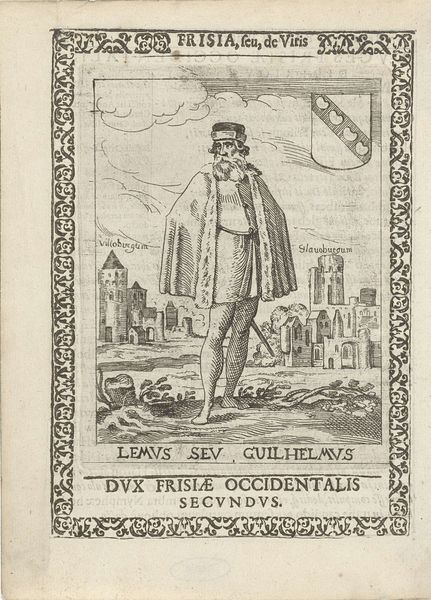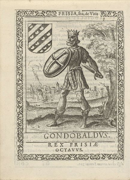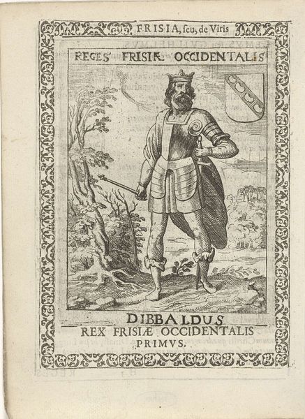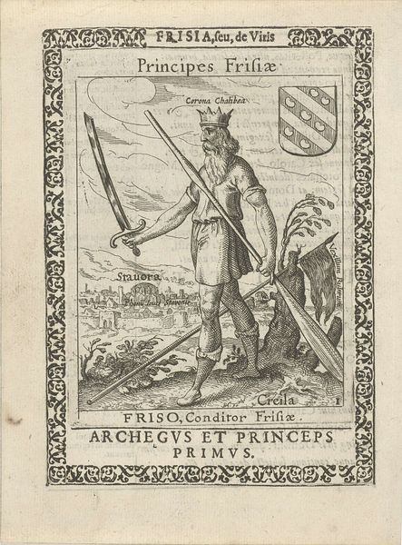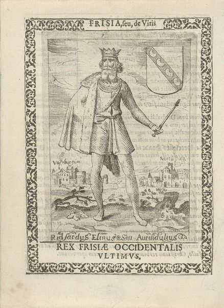 This engraving of Willem II, second king of the West Frisians, was made by Pieter Feddes van Harlingen in the 17th century. It depicts Willem wearing a crown and cape, holding a staff in front of a landscape featuring a coat of arms and the settlement of 'Harlinga'. Pieter Feddes van Harlingen worked during the period that saw the rise of the Dutch Republic. Prints like this one contributed to a sense of Dutch identity and national pride, often relying on historical and mythological themes. Frisia, corresponding to the northern parts of the Netherlands and Germany, was an important region in the Roman period. The text in the engraving emphasizes the region and its people. The image creates meaning by positioning Willem as the king of this region and by using the visual codes of royalty, such as crown, staff and cape. Art historians examine prints like this in the context of the printmaking industry and the cultural function of images. We would study iconographic sources, coats of arms, and texts from this period to better understand its meaning. This reveals the crucial role of art as something that is embedded in complex institutional and social structures.