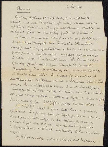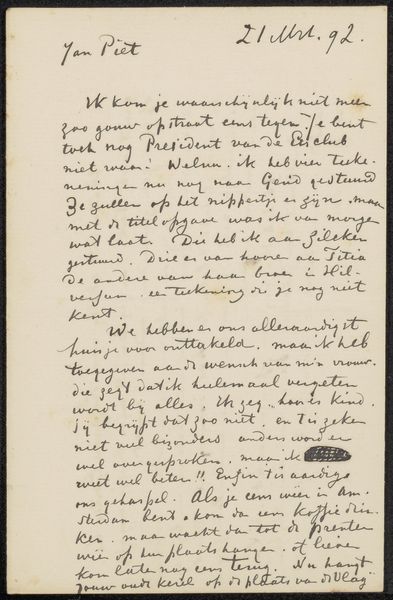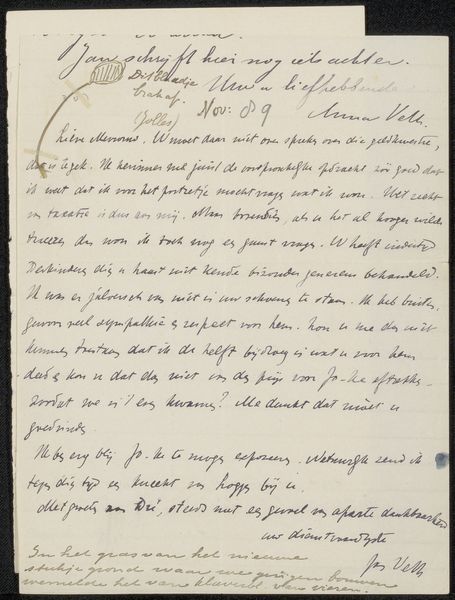 Editor: Here we have "Brief aan Ina van Eibergen Santhagens-Waller" by Richard Nicolaüs Roland Holst, dating from around 1878 to 1938. It's ink and pen on paper, and held at the Rijksmuseum. Looking at the handwriting, it almost feels like peering into someone's private thoughts, but also a very deliberate creation with beautiful penmanship. What strikes you most about this letter? Curator: It’s interesting that you call it a "deliberate creation," emphasizing its *made* quality. For me, it’s fascinating to consider the materiality of this letter, beyond just ink on paper. Think about the socio-economic context. What kind of paper was this? How readily available was ink? And, what does the very *act* of hand-lettering, of consciously crafting each word, signify in a rapidly industrializing world? Is this a form of resistance to mass production? Editor: That's a really interesting point! I hadn't thought about the resistance aspect. I was more focused on the intimacy, but the choice of materials and the labor involved… So, are you suggesting that the medium itself is a commentary on the changing modes of communication during that era? Curator: Precisely. This wasn't a quick typed note or telegram. The slowness, the deliberate hand, and even the inherent imperfections of handwriting… These elements all push back against the mechanized forms of communication that were becoming increasingly prevalent. We might also ask how the intended recipient would have perceived this laborious method of communication versus a more common approach. Editor: So, understanding the materials and the process behind this letter offers a deeper understanding of the social and historical context? It’s not just about the content, but also about how that content was physically delivered? Curator: Exactly! The means of production – the physical act of writing, the choice of materials – shape our understanding of the work and its place within the broader cultural landscape. It also blurs lines between simple communication and higher creative purposes. Editor: That really changes how I see the letter. It's more than just words on paper. Thanks! Curator: Indeed. It’s a powerful reminder that even the most seemingly personal objects are embedded within complex systems of production and consumption.