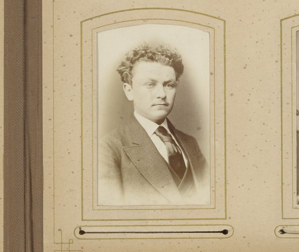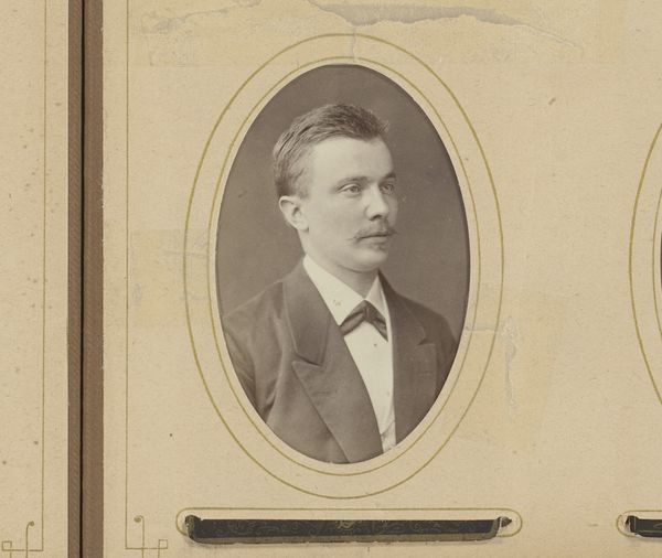 Curator: Welcome to the Rijksmuseum. We are now standing before "Portret van een man met baard", or "Portrait of a Man with Beard," a photograph attributed to Josephus Hendrikus Petrus Coppens, and dated between 1889 and 1925. Editor: This piece, despite being relatively small, possesses an air of intense sobriety, perhaps even melancholy. It feels as if he is looking *through* us rather than *at* us. Curator: Let’s delve into the photographic choices. Note the classical pose, shoulders squared, head centered, with sharp focus on his eyes. The limited tonal range and soft blurring toward the edges of the photograph contribute to its formality, a sort of stiff respectability. Editor: But this constructed respectability begs the question: What does it mask? Given the likely historical period, it is tempting to view this through the lens of late 19th, early 20th-century societal constraints. A portrait like this, with its determined, stoic visage, could represent the pressures and expectations placed upon men. What emotions, what inner life, is he suppressing? Curator: An interesting, although perhaps speculative reading. I am more inclined to look at what is immediately presented within the frame. The dramatic lighting, with light hitting primarily his face and the dark clothes surrounding it, create contrast that demands your focus be directly on him. I suggest looking to realism and technique. Editor: Indeed, technique informs the narrative here, as does a consideration of social structures. The stark, almost brutal honesty in his gaze, enabled by photographic realism, clashes with the conventions of portraiture at the time, adding a layer of quiet defiance against constructed masculinity. Curator: While you focus on these exterior aspects, I find my attention being drawn more to the composition and stark tonality to really discover and unearth what makes it worthy as art. It is, for me, the play of these intrinsic qualities. Editor: For me, it’s where these artistic qualities meet social reality that the real value is found. Thank you for this very helpful overview.