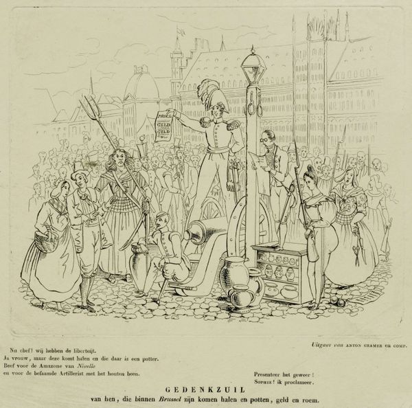 Editor: This print, "Spotprent over minister Du Tour van Bellinchave," made in 1886 by Jan Holswilder, utilizes ink, drawing, and engraving to create quite a satirical scene! The scale and caricature feel…almost cruel. How do you interpret this work? Curator: This print is deeply rooted in the political and social landscape of the Netherlands in 1886. Given the title, the central figure is undoubtedly a satirical depiction of Minister Du Tour van Bellinchave, presented as Sinterklaas, Saint Nicholas. Think about what Sinterklaas traditionally represents: generosity, gift-giving, justice. Here, it seems those concepts are being twisted, made ironic. What does the setting suggest to you? Editor: It seems…oppressive? Almost like a prison with those barred windows, and everyone seems rather downtrodden, except maybe the Minister. Curator: Exactly! Holswilder critiques power through the lens of social commentary. Consider the other figures. Why are they included? What purpose do they serve in communicating Holswilder’s message about Minister Du Tour van Bellinchave? It appears the artist is presenting a clear view of society to their contemporary viewers. It may very well have served to reinforce already present notions in some circles. Editor: So, by twisting the imagery of Saint Nicholas, who is normally seen as generous, and setting him in a prison-like setting, the artist is trying to reveal that Minister Du Tour van Bellinchave’s actions are contrary to justice and public welfare? It is interesting to see how cultural figures become entangled in politics. Curator: Precisely. And don't overlook the overt racism with “Zwarte Piet”. This piece invites reflection on the relationship between those in power, cultural expectations, and political realities in that specific time period. It served a vital public role in sparking debate and questioning authority. Editor: It really highlights the political and social power of art! Thank you; I hadn't considered the role of familiar characters and public sentiment.