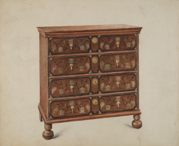 Curator: So, here we have "Painted Chest of Drawers," created around 1938. The artist employs a mix of mediums – drawing, painting, even mixed-media elements to render this everyday object into something quite striking. Editor: Oh, wow. It's immediately quite somber, almost medieval, but with these touches of unexpected bright color… it has a strangely captivating duality. Like secrets kept safe in a sturdy box. Curator: Indeed. The piece uses wood, transformed into a decorative object. What I find interesting is its seeming functionality contrasted with its rich decoration. We’re considering how decorative art intersects with, and elevates, the everyday. Chests of drawers became ubiquitous in homes as storage became more efficient, and domestic spaces evolved during this period. Editor: I'm fixated on these intricate details. They have that feeling of folk art and handcrafted passion, a dedication to making the mundane… magic. It's the care, you know? You feel it humming off the surface, the history held within it. Curator: Precisely. The side especially features stylized tulip motifs that speak to genre painting tradition while fitting into the decorative art space of the time. It makes me wonder about the piece’s creator: were they intentionally referencing or consciously stepping away from conventional expectations? Editor: Or both, naturally. It is trying to balance the function of something that you own versus something that you look at and dream through. As a viewer, it whispers of time slowed down, almost demanding we pause. The deep wood hues remind me of earth, of nature patiently creating its art, and yet with an almost modern perspective on geometry and design. Curator: Exactly! That balance, the tension, I believe it reveals to us much about the artist's individual spirit as much as about the decorative arts in this specific period. We are seeing echoes of different techniques throughout. Editor: It all feels beautifully deliberate, a conversation between function and fancy. And those little pops of crimson in contrast… oh, they are delightful. Thanks for sharing this. I feel like I know this artist so much better now!