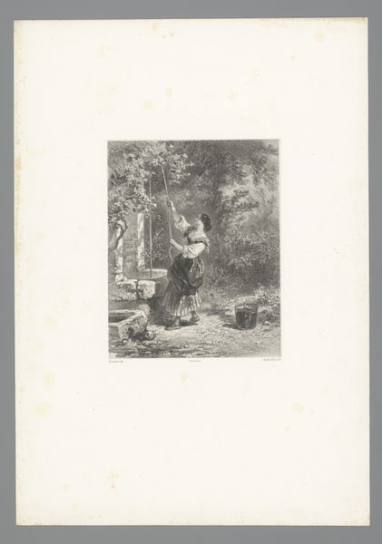 Célestin Nanteuil's etching presents a compelling study in tonal contrasts and textures, depicting a man and a pig traversing a wooded area. The composition is structured by the diagonal line of the slope. The etching technique used emphasizes the rough textures of the forest floor, contrasting with the smoother rendering of the figures. Nanteuil's strategic use of light and shadow creates a sense of depth. The forest is not merely a backdrop; it actively engages with the figures, suggesting themes of nature and the individual’s place within it. There's an intriguing semiotic interplay at work here. Is the pig simply a farm animal, or does it carry symbolic weight, perhaps questioning the clear divisions between man and animal? The textures and tones, orchestrated by Nanteuil, provoke questions about our relationship to the natural world. Ultimately, the artwork destabilizes any fixed interpretation.