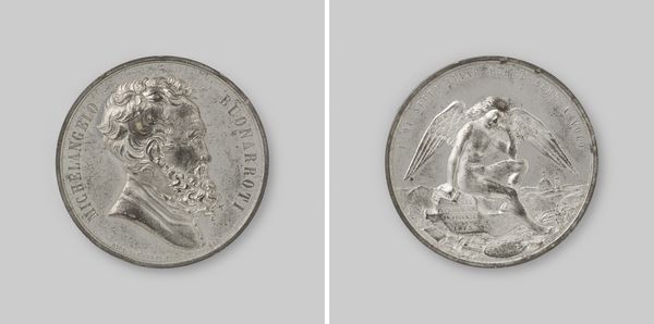 Curator: Oh, this object gives off such a silvery shimmer, a tangible memory, a whisper of grandeur... it's moving, almost. Editor: Indeed. What we have here is a bronze or metal commemorative medal, dating back to 1852. It depicts "The Unveiling of a Statue for Rembrandt van Rijn in Amsterdam, in the Presence of William III, King of the Netherlands," by Moses de Vries. Curator: Bronze, really? It has that cool, collected shimmer, the gravitas you associate with important anniversaries. I almost imagined myself there, jostling through the crowds, squinting in the muted light of a Dutch morning... Editor: Observe the inscription around the relief. The artistry and skill in crafting this object. It marks a very public moment, yet you have an intimate commemorative object designed to be held, passed on, maybe even worn. Curator: So it’s like catching lightning in a bottle—or rather, remembrance in bronze! Look at Rembrandt's profile! So somber and noble—almost godlike. And on the other side, the figure of Rembrandt himself. It makes me think: did Rembrandt ever envision such public acclaim, generations after his death? Editor: I suspect he hoped for lasting recognition, but perhaps not quite in this monumental fashion. The medal presents Rembrandt's talent as the production of commodities of sorts. Casts. Molds. Public displays… Curator: Yet, still, the human heart beats in it—or mine, at least! It makes me feel a little of his fire, the urgency, of course, and then, after so much time...the respect, bordering on something almost religious. Editor: It certainly emphasizes the enduring cultural and political significance of artists and artworks, the value systems within making of and within owning of...It underscores that relationship beautifully. Curator: To think—holding that slice of history in your palm. Art made for celebration and in celebrating Art. I love its quiet thunder! Editor: Yes. A physical encapsulation of historical events. These material objects do much work for us. Food for thought!