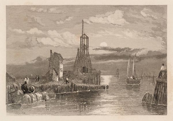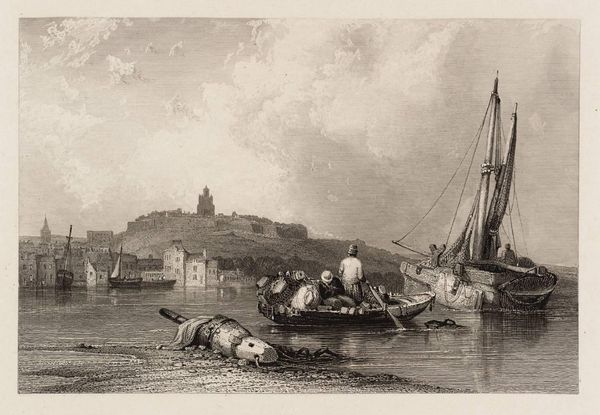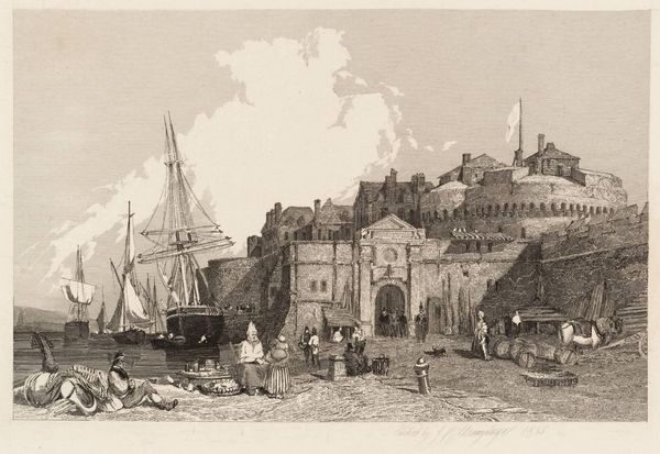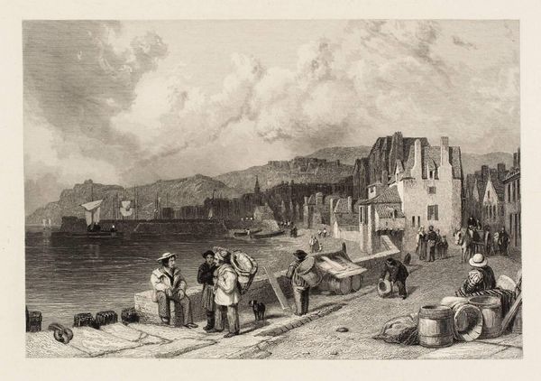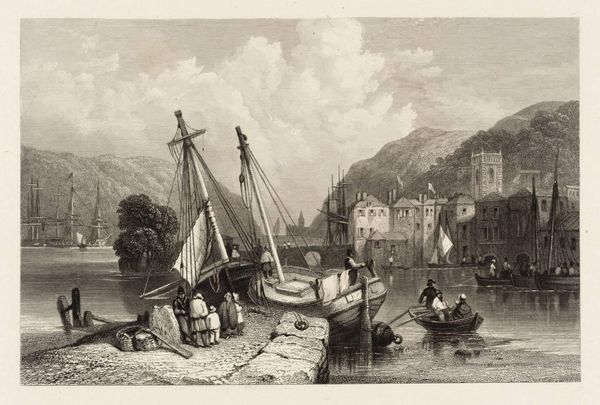 Editor: This is "Dartmouth," an engraving by J.B. Allen after Clarkson Stanfield. It's a detailed depiction of a harborside scene. I’m struck by how much detail is packed into such a small image. What can you tell me about its historical context? Curator: Consider how Stanfield, a celebrated marine painter, used this imagery. The engraving, reproduced widely, brought picturesque views of Britain to a broader public, reinforcing national identity and pride in maritime power. How does the inclusion of both working vessels and naval ships contribute to this narrative? Editor: I see what you mean! It's not just a pretty picture; it's about projecting Britain's strength and reach. That’s something I hadn't initially considered. Curator: Exactly. The print participates in the era's visual culture of empire. It’s fascinating how art shapes and reflects societal values. Editor: Definitely gives me a lot to think about. Thanks for sharing that perspective.