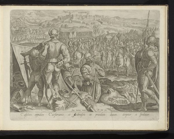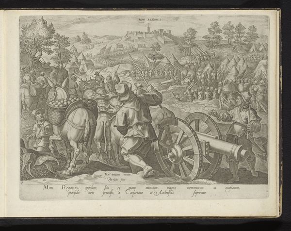 Curator: Here we have "Belegering van Camollia en Siena," or "Siege of Camollia and Siena," an engraving from 1583 by Philips Galle. You can find it in the Rijksmuseum. Editor: Woah, what a snapshot. It’s like peering through time—a little grainy, but intensely alive with tiny figures. A city trembling on the horizon? Curator: Indeed. This piece commemorates a pivotal moment in history. The siege is a deeply loaded image of power and conflict, a visual document echoing through the ages. Note how the lanterns held by the soldiers illuminate their grim mission. The glow acts as a psychological focal point, highlighting purpose amid chaos. Editor: Psychological indeed! Those lanterns—they cast such long, severe shadows. It sets the stage as if we're bracing for something monumental to unfold. Are those...flames? Maybe the emotional undercurrent of this engraving, beyond military strategy, lies in its ability to portray fear and tense anticipation. Curator: Very astute. Fire serves often as a metaphor for purification and destruction. In siege imagery, it embodies the relentless pressure and potential ruin, evoking primal fears connected with safety and home. Beyond just representing physical danger, it plays with existential dread. Editor: Home! Yes, it’s about home! Looking at it from a different angle, perhaps it’s not just about military campaign, but about disruption to a society, loss of personal identity—almost like looking at what remains behind in wartime: displaced populations or existential threat for people within that distant cityscape. Curator: That is exactly the kind of dialogue I am after. It moves from a surface portrayal of war to delving deeply into how a landscape tells its historical narrative through symbols that address larger societal anxieties. Editor: Art is never *just* what it shows, but the shadows and resonances it creates. Now looking at it, I can hear a story instead of seeing static conflict; all down to looking at what’s NOT clearly said!