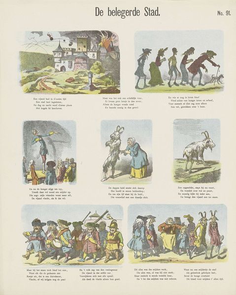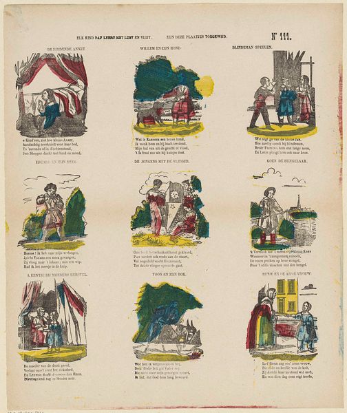 Editor: This is "Zit daar wat lekkers in dien mand?," which translates to "Is there something tasty in that basket?", a lithograph print by Albertus Willem Sijthoff, dating between 1861 and 1929. I am really drawn to how each square captures a different scene or small story. What is striking to you about the print’s composition? Curator: Notice how each scene, while seemingly self-contained, utilizes similar colour palettes – primarily blues, browns and muted yellows. These echo throughout the piece, creating a formal harmony across the entire grid. Consider also how the artist uses line. There is a graphic quality, each scene delineated clearly from the others. It's a deliberate structural decision. Do you observe any pattern regarding the figure arrangement? Editor: I see. Most scenes have at least one figure in blue, which anchors the eye as it travels through the print. So, the colour creates a visual rhythm, despite each mini-narrative being separate. But why use this comic strip style with so many frames? Curator: Precisely! The artist emphasizes the artwork as a whole composition by repeating figures. This could relate to contemporary serial storytelling, where repetition with slight variation drives narrative progression. Also, consider the inherent grid. How might that speak to broader semiotic structures of the time? Editor: I guess using a rigid layout would emphasize societal structures, a way of showing children that life is about fitting in or that communities follow the same moral script? Thanks, looking at the image as a structural framework, rather than as individual scenes, really sheds light on Sijthoff’s purpose. Curator: Indeed. The structure gives us deeper access to decode cultural meaning.