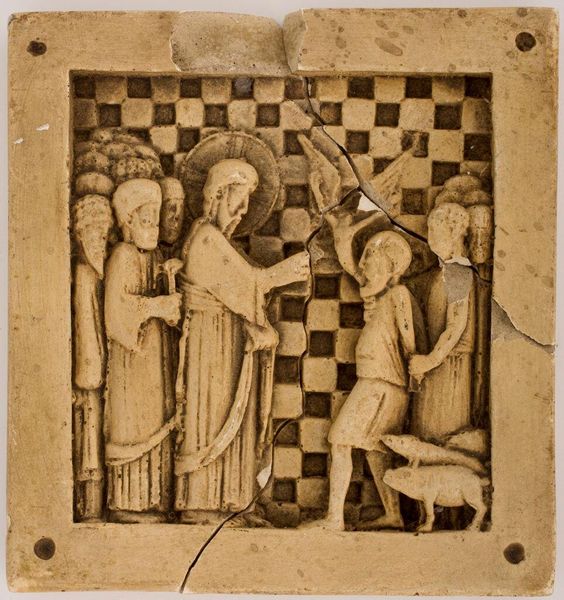 Editor: Here we have an ivory relief carving, “Christ Raising the Widows of Mite,” by an unknown artist. It’s small, but the level of detail is incredible. How would you interpret the process and materials used? Curator: I'm struck by the socio-economic implications of ivory as the raw material. Its sourcing and the labor involved in carving this relief likely speak to power dynamics and access to luxury goods within a specific historical context. Editor: That makes me think about the skill and time needed to create something like this. Curator: Precisely. The material itself and its transformation into this image are central to understanding its cultural value and the message it conveys. The process defines the piece. Editor: I never thought about ivory in that way before! Curator: It's crucial to consider materials and processes, they shape our understanding.