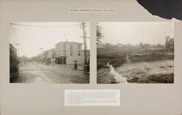 Curator: The squalor in this stark photographic diptych is striking. Jessie Tarbox Beals captured these housing conditions in Newark, New Jersey. The medium is gelatin silver print. Editor: It’s hard to ignore the sheer volume of waste. The materials are presented to us bluntly – garbage and rudimentary housing. I'm struck by the contrast between the intent of home-building and the reality of these conditions. Curator: Exactly. Beals was a pioneering female photojournalist who often focused on marginalized communities. This work underscores the systemic inequalities in housing and sanitation affecting the poor in early 20th-century urban America. Consider the absence of infrastructure. Editor: The lack of sanitation speaks volumes, literally. The refuse is integral; it points directly to failed systems. Whose labor maintains, or fails to maintain, these spaces? Where does the waste stream lead? Curator: It forces us to consider intersections of race, class, and gender. Who is afforded dignity, and who is not? Editor: The photographs compel us to confront the unvarnished reality of how material conditions shape lives. Curator: It's a crucial reminder of the human cost of inequitable policies.