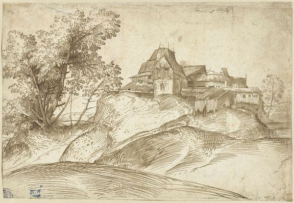 Curator: Here we have Rembrandt van Rijn’s "Landscape with a farm building and the 'house with the tower'," a pen and brown ink drawing on paper, dating from about 1650. It's currently held at the Rijksmuseum. Editor: Wow, it’s like a captured moment of quiet observation. You almost feel the weight of the air. So simple, yet dense. And what about the landscape? There's a house, seemingly abandoned, the dark tower watches, I immediately want to weave a fairy tale about the lives that have lived there. Curator: That response chimes beautifully with how I see this work. The landscape here functions almost as a repository of cultural memory. Notice the deliberate depiction of the traditional thatched-roof building. It represents not just rural life, but also a connection to older, perhaps simpler values rooted in community. Editor: Right, there is a quiet narrative, a subtle symbolism. He uses line work in a way to hint, not just to depict the thatched roofs but to make me *feel* them. You mentioned the buildings; the “house with the tower” in the background almost feels… judgmental. Is that just me projecting? Curator: Well, consider the psychological implications. Towers, architecturally, represent power and aspiration. But visually, within this pastoral setting, it evokes a sense of detachment, or even alienation from the organic unity of the rural landscape. This house becomes, thus, not only a geographical but also a psychological landmark. Editor: I am always surprised by the magic of scale. Knowing it’s a drawing on paper, an intimate piece, makes the sweeping feeling of open space almost paradoxical. Did people back then appreciate these scenes the same way? Do you think they recognized something deeper in the common place? Curator: Absolutely. Dutch Golden Age landscapes weren't merely topographical records; they expressed emerging national identity. Landscapes helped cultivate pride in the homeland and resonate as strong statements of cultural self-assurance, laden with the spirit of "Dutch-ness". This little drawing is such a vast encapsulation. Editor: A cultural treasure, deftly and magically rendered. I see new narratives with each gaze. Curator: Indeed, the longer we engage, the more that subtle psychological undercurrent comes to light, as if we were peering into Rembrandt’s inner world while he captures an old forgotten tower in rural Netherlands.
